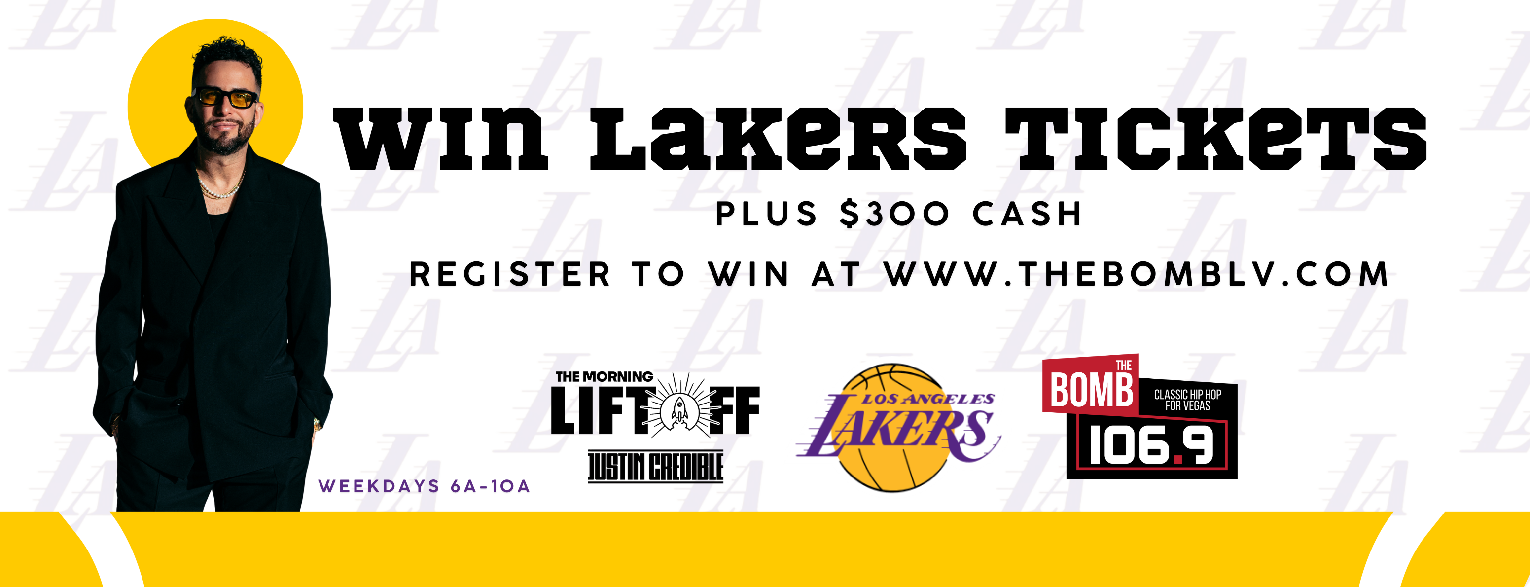106.9 The Bomb is the Official Las Vegas Station for the L.A. Lakers—Register NOW to get in to win Lakers tickets plus $300. Grand Prize winners will be called with The Morning Lift Off with Justin Credible.